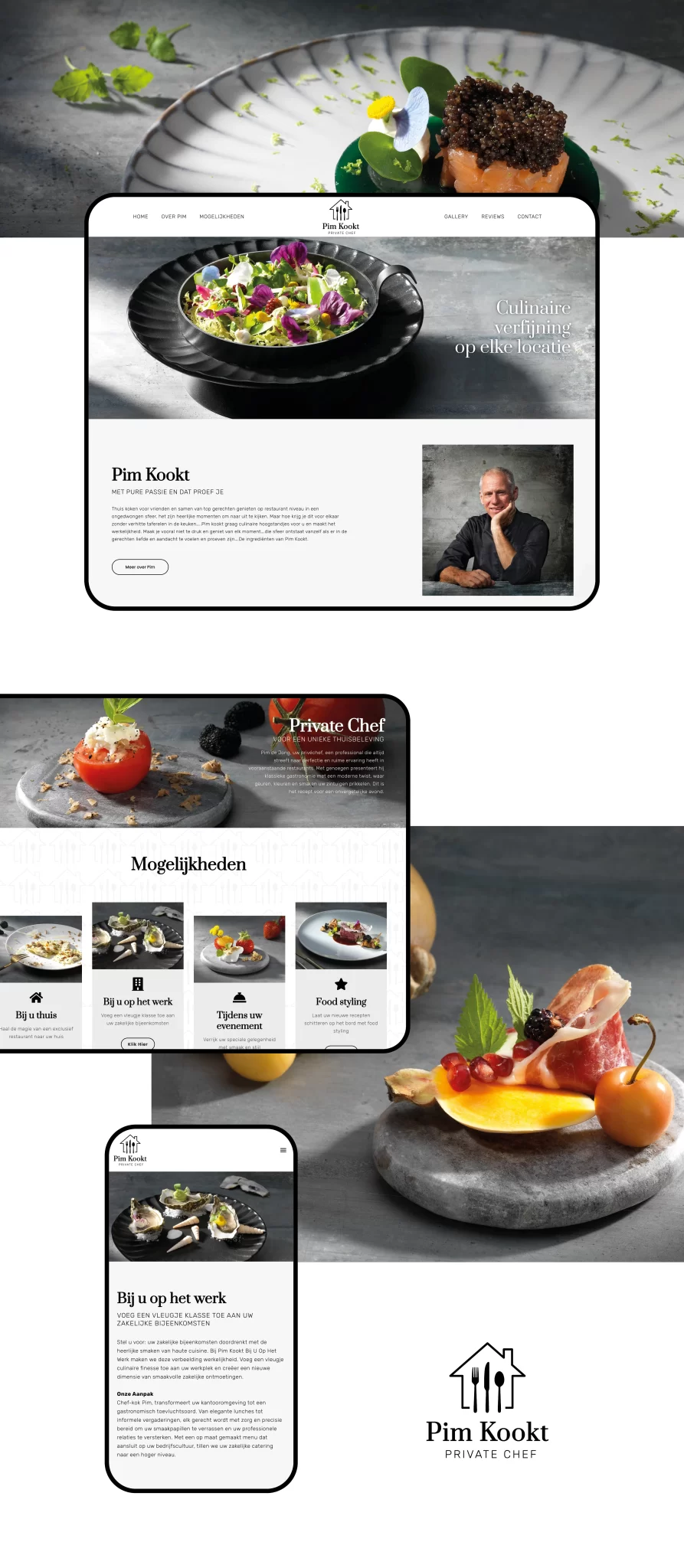 Voor Pim Kookt creëren we niet zomaar een branding, maar een ware culinaire beleving vastgelegd in een helder en verfijnd logo, smaakvolle fotografie van BC fotografie en een frisse website.